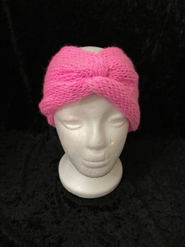 Twist Headband / Hat / Scarf Set in bright pink. Comfortable and soft with faux fur pop poms.