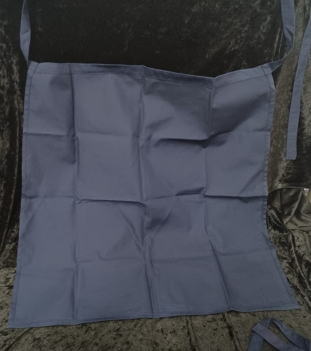Navy apron, ties at the back. Measures approx 60cms square.